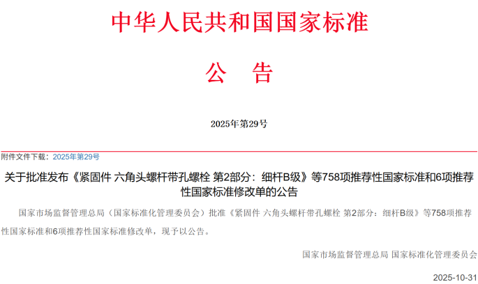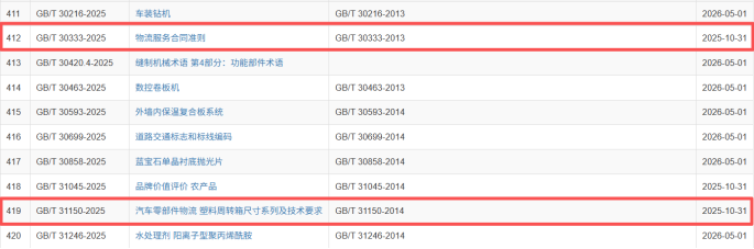 2025年10月31日,国家市场监督管理总局、国家标准化管理委员会发布2025年第29号公告,其中由全国物流标准化技术委员会提出并归口的《物流服务合同准则》(GB/T 30333-2025)、《汽车零部件物流 塑料周转箱尺寸系列及技术要求》(GB/T 31150-2025)、《物流单证基本要求》(GB/T 33449-2025)3项国家标准被批准发布。