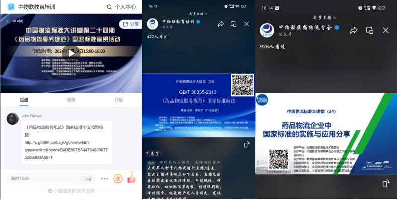 2024年7月29日下午,中国物流标准大讲堂第24期《药品物流服务规范》标准宣贯活动以线上直播形式举办。物流从业人员、物流专业院校师生1800余人次通过小鹅通“中物联教育培训”直播间、微信“中物联教育培训”“中物联医药物流分会”视频号三个平台参加了宣贯活动。