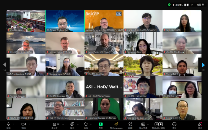 ISO中央秘书处技术项目经理Takahashi Maho、ISO/TC 344主席何明珂、ISO/TC 344秘书长肖书怀,以及来自中国、日本、韩国、芬兰、法国、德国、挪威、奥地利、西班牙等多个国家的近40位专家和代表参加了本次会议。