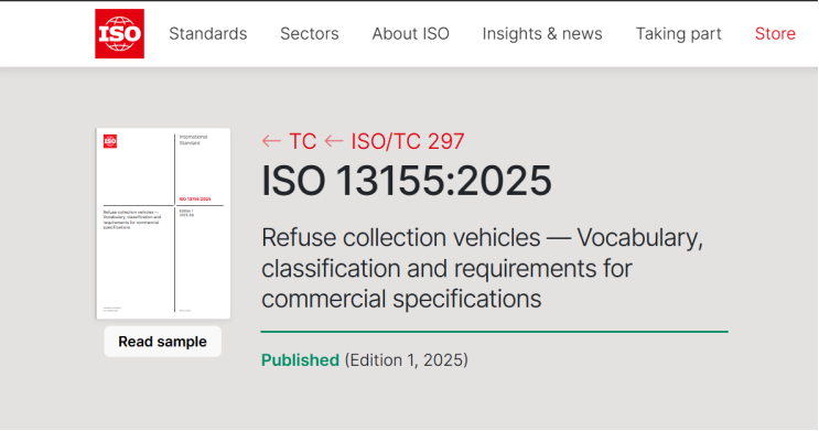 2025年8月,由中国牵头制定的《垃圾车词汇、分类和商业规格要求》(ISO 13155:2025)国际标准正式由国际标准化组织(ISO)发布。