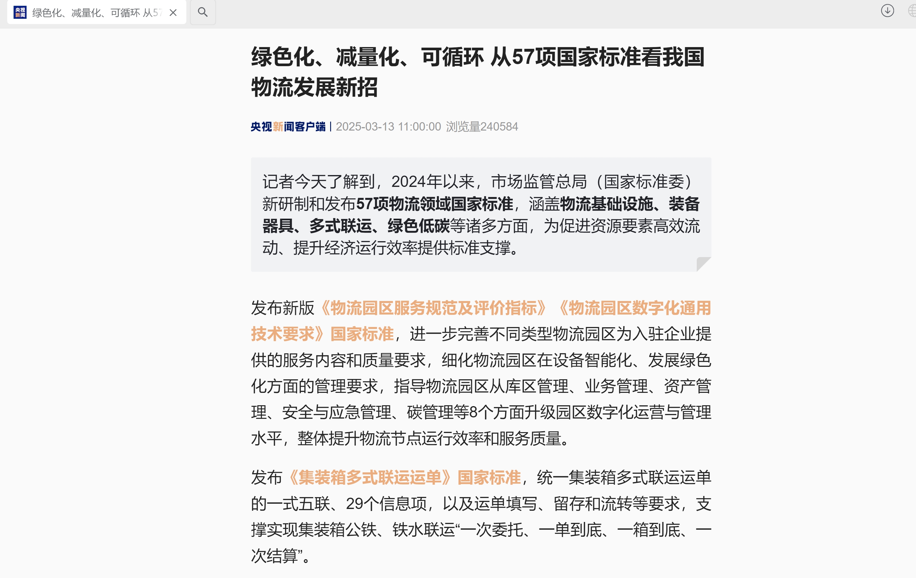 2025年3月13日,央视新闻报道:2024年以来,市场监管总局(国家标准委)新研制和发布57项物流领域国家标准,涵盖物流基础设施、装备器具、多式联运、绿色低碳等诸多方面,为促进资源要素高效流动、提升经济运行效率提供标准支撑。